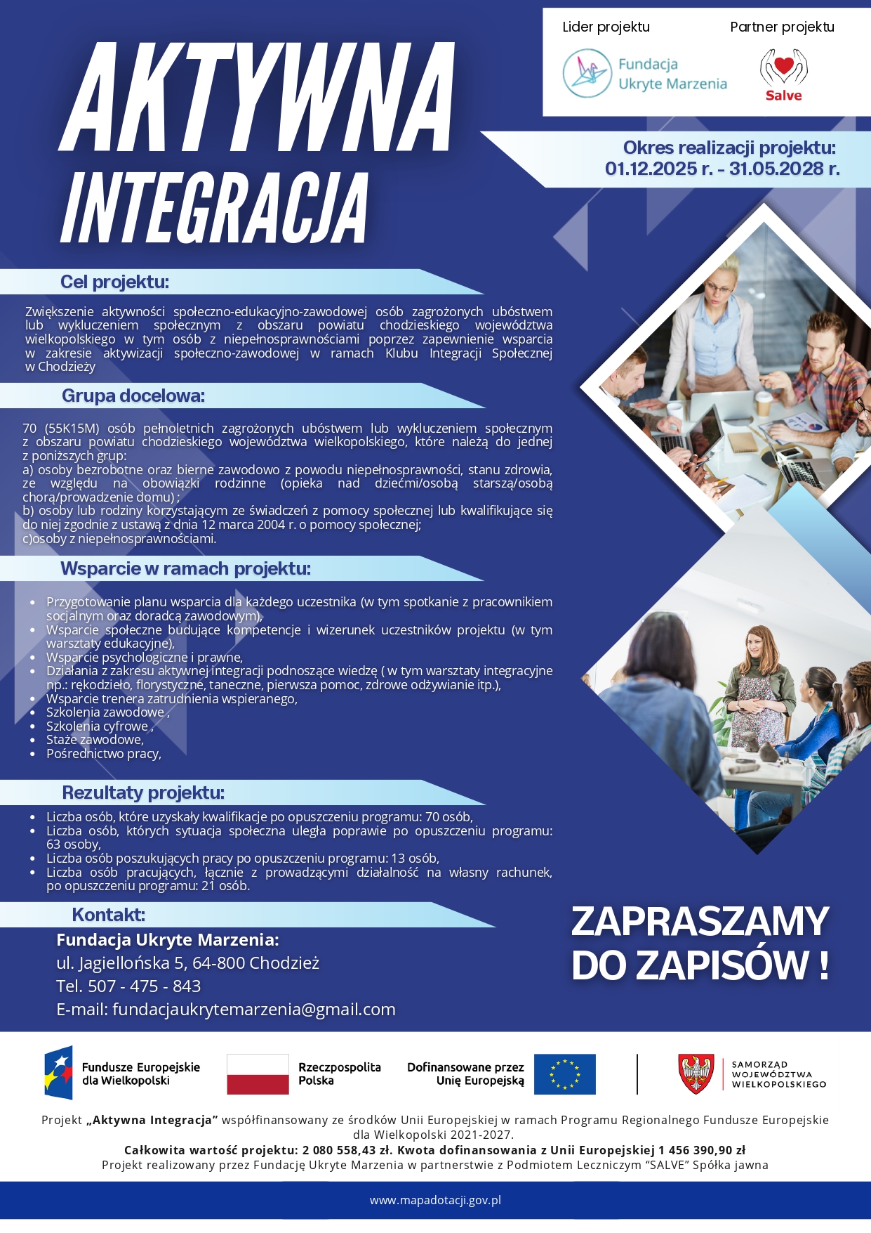 Projekt realizowany jest przez Fundację Ukryte Marzenia w partnerstwie z GOPS Budzyń w ramach Lokalnej Strategii Rozwoju Stowarzyszenia “Dolina Noteci” w ramach Priorytetu 09 Rozwój Lokalny Kierowany przez Społeczność Działanie 9.6 Aktywizacja społeczna osób najbardziej zagrożonych wykluczeniem społecznym, budowanie lokalnego potencjału społeczeństwa obywatelskiego, współfinansowanego z Europejskiego Funduszu Społecznego Plus w ramach programu Fundusze Europejskie dla Wielkopolski 2021-2027