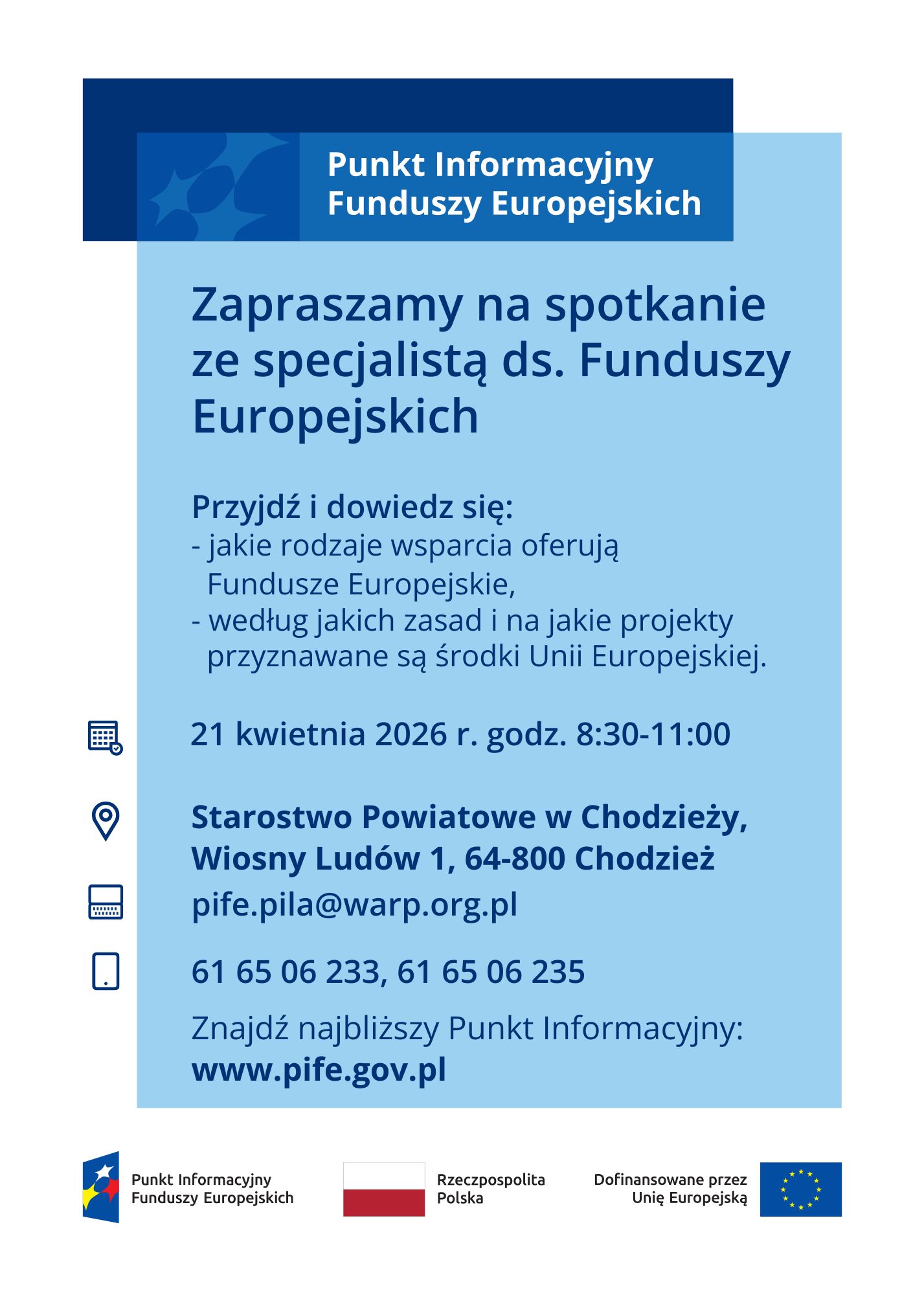 Informujemy, że Punkt Informacyjny Funduszy Europejskich w Pile organizuje w dniu 21.04.2026 r. Mobilny Punkt Informacyjny w: