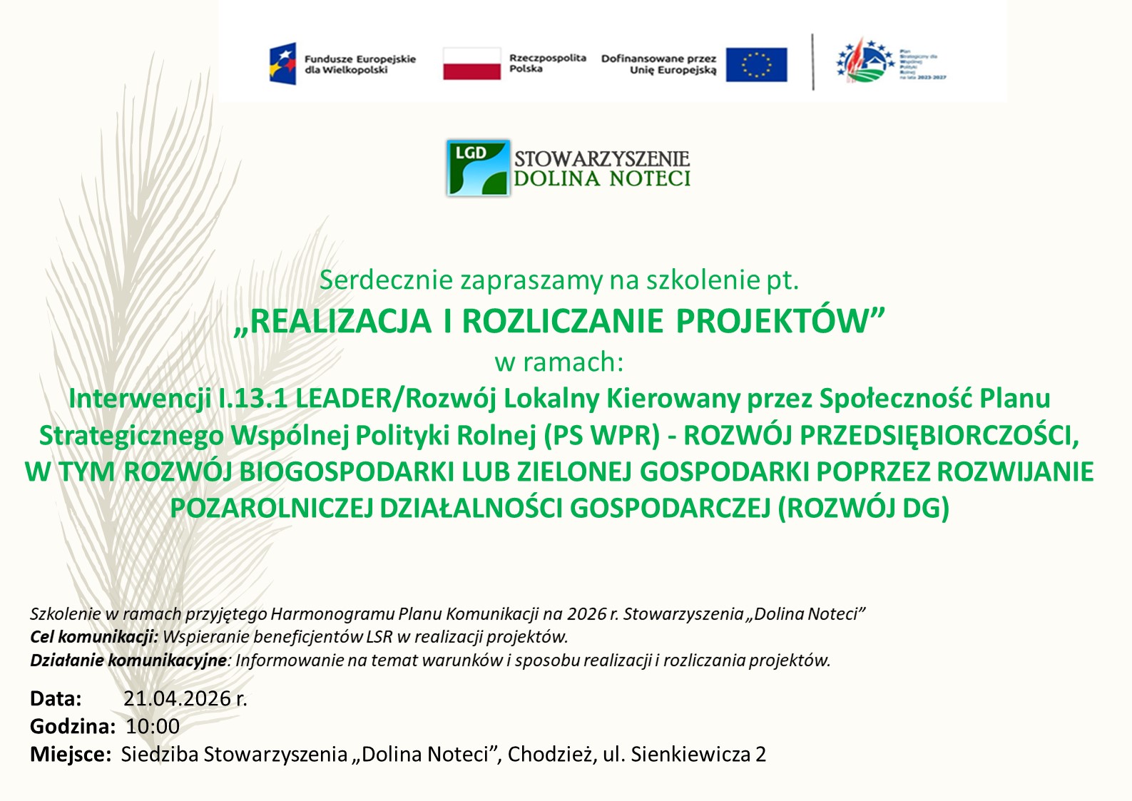 W dniu 31.03.2026 r. w siedzibie Stowarzyszenia “Dolina Noteci” odbyło się szkolenie nt. „REALIZACJA I ROZLICZANIE PROJEKTÓW” w ramach realizacji Harmonogramu Planu Komunikacji na 2026 rok, w ramach Interwencji I.13.1 LEADER/Rozwój Lokalny Kierowany przez Społeczność Planu Strategicznego Wspólnej Polityki Rolnej (PS WPR) – ROZWÓJ WSPÓŁPRACY POPRZEZ TWORZENIE KRÓTKICH ŁAŃCUCHÓW DOSTAW ŻYWNOŚCI (START KŁŻ).